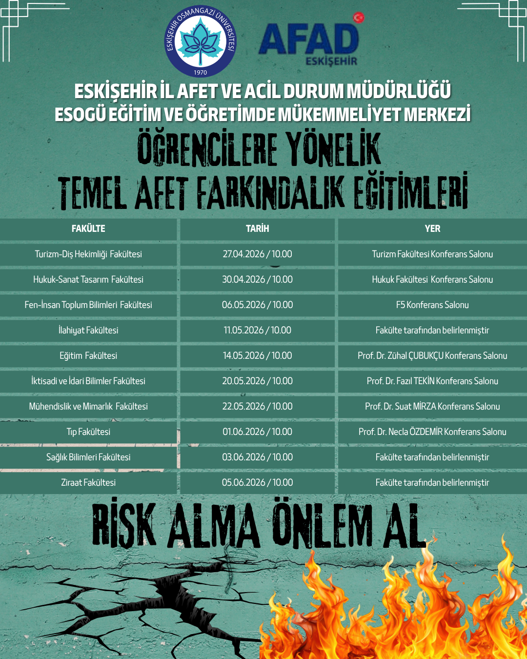 Afet ve Acil Durum Yönetimi Başkanlığı ile Yükseköğretim Kurulu Başkanlığı arasında; üniversitelerde afet farkındalığının artırılması, risklerin azaltılması ve afet gönüllülüğünün geliştirilmesi amacıyla 4 Mart 2026 tarihinde protokol imzalanmıştır. Protokolün ilgili maddeleri uyarınca, Üniversitemiz Eğitim ve Öğretimde Mükemmeliyet Merkezi, ESOGÜ Arama ve Kurtarma Birimi ile Eskişehir İl AFAD Müdürlüğü ortaklığında öğrencilere yönelik Temel Afet Farkındalık Eğitimleri düzenlenmesi planlanmış olup; ayrıntılar aşağıda yer almaktadır. Her öğrenci kendi fakültesinde ilgili tarihteki Farkındalık Eğitimlerine katılabilir.